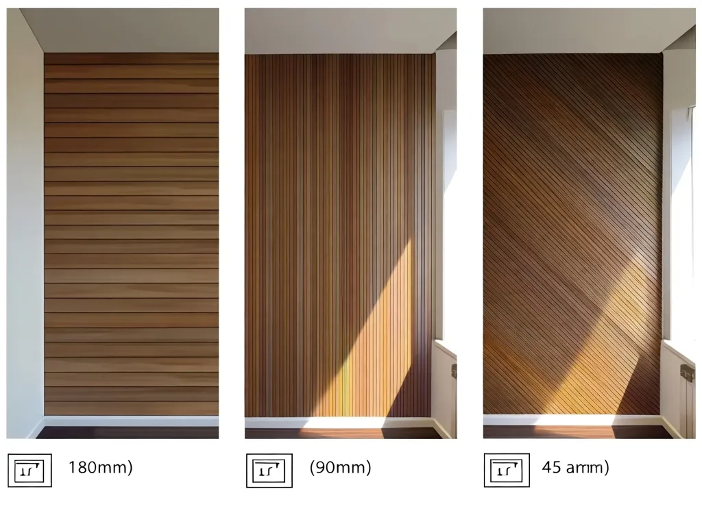 Taille des lames : Larges lames (180-200 mm) donnent une sensation d'élégance et d'espace. Lames étroites (60-90 mm) créent une texture plus dense, intéressante sur des murs de petite taille.
