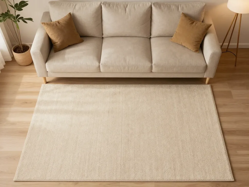 Pour un rendu "composé" et luxueux, le tapis doit dépasser les bords du canapé de minimum 20 cm de chaque côté. Idéalement, les pieds avant du canapé doivent reposer entièrement sur le tapis, créant une zone définie et cohésive.