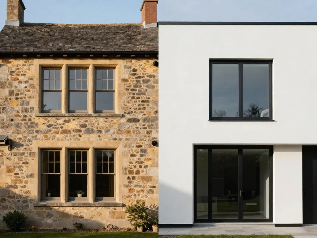 L'harmonie (ton sur ton) : Cette stratégie fonctionne parfaitement pour les maisons anciennes ou en pierre. Des menuiseries beige clair ou gris galet s'effacent discrètement, laissant la vedette à la maçonnerie.