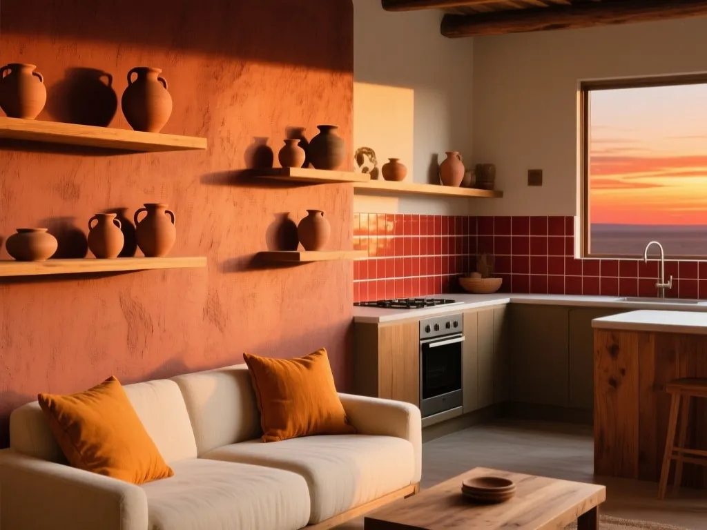 Pas question de repeindre tout votre appartement en rouge. L'astuce réside dans l'emplacement stratégique : un mur de tête de lit en rouge brique foncé, un angle de cuisine en ocre brûlé, un massive de pots en terre cuite sur un mur neutre.