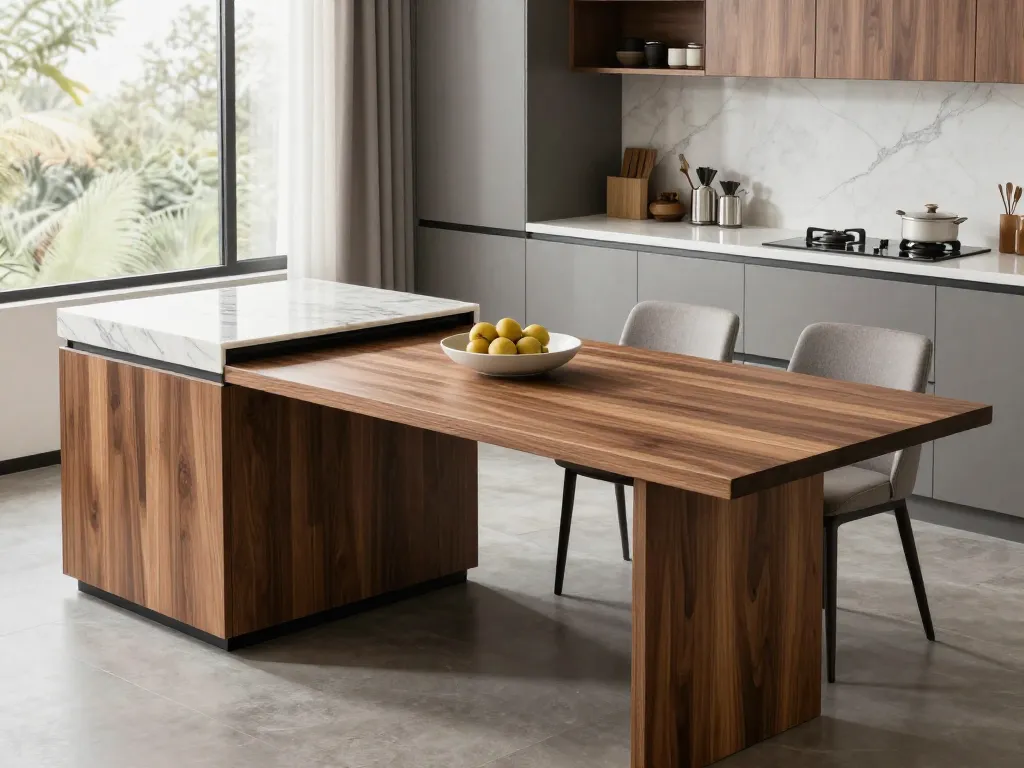 L'harmonie totale : le plateau de table reprend le même matériau que le plan de travail (quartz, granit, bois massif). L'effet est épuré et cohérent.