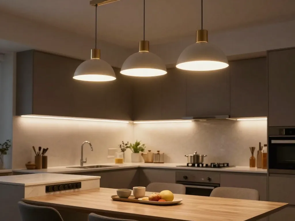 Lumière technique : spots ou rubans LED à 4000K (blanc neutre) sur le plan de travail pour une excellente visibilité.