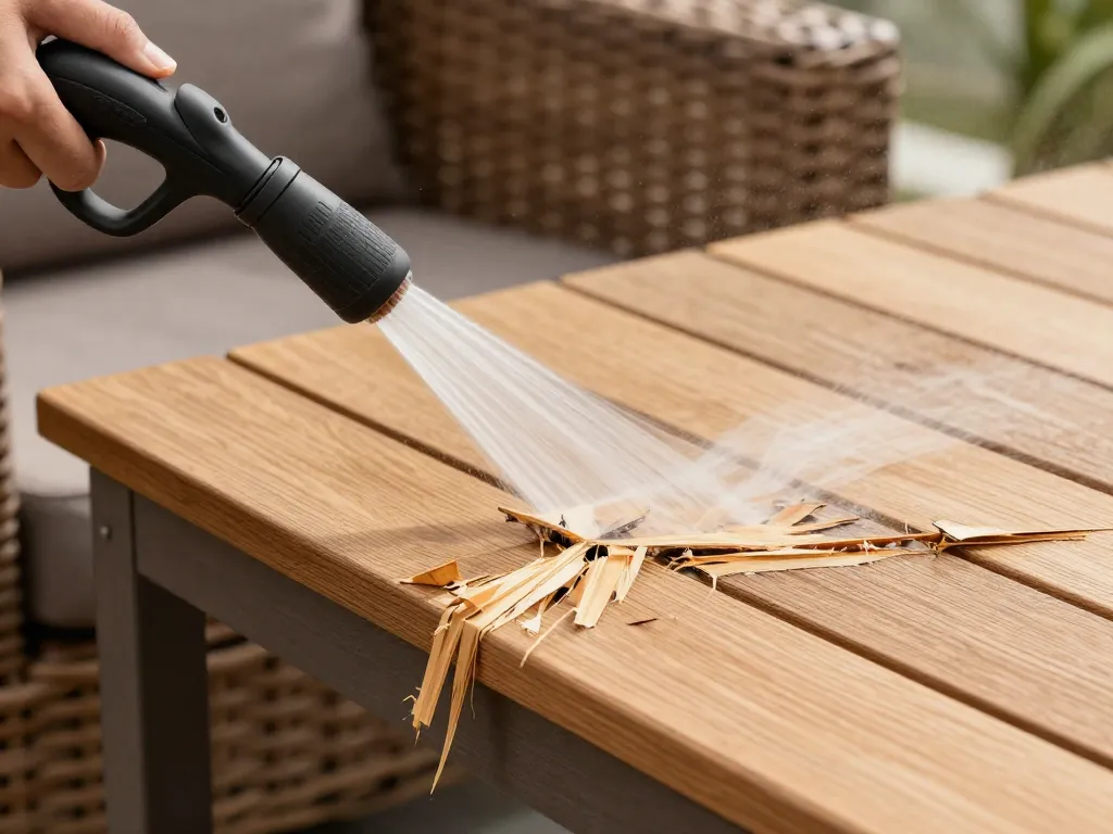 L'utilisation d'un nettoyeur haute pression est déconseillée sur le bois et la résine tressée. La puissance du jet détruit les fibres du bois (créant des échardes) et peut déchirer le tressage synthétique.