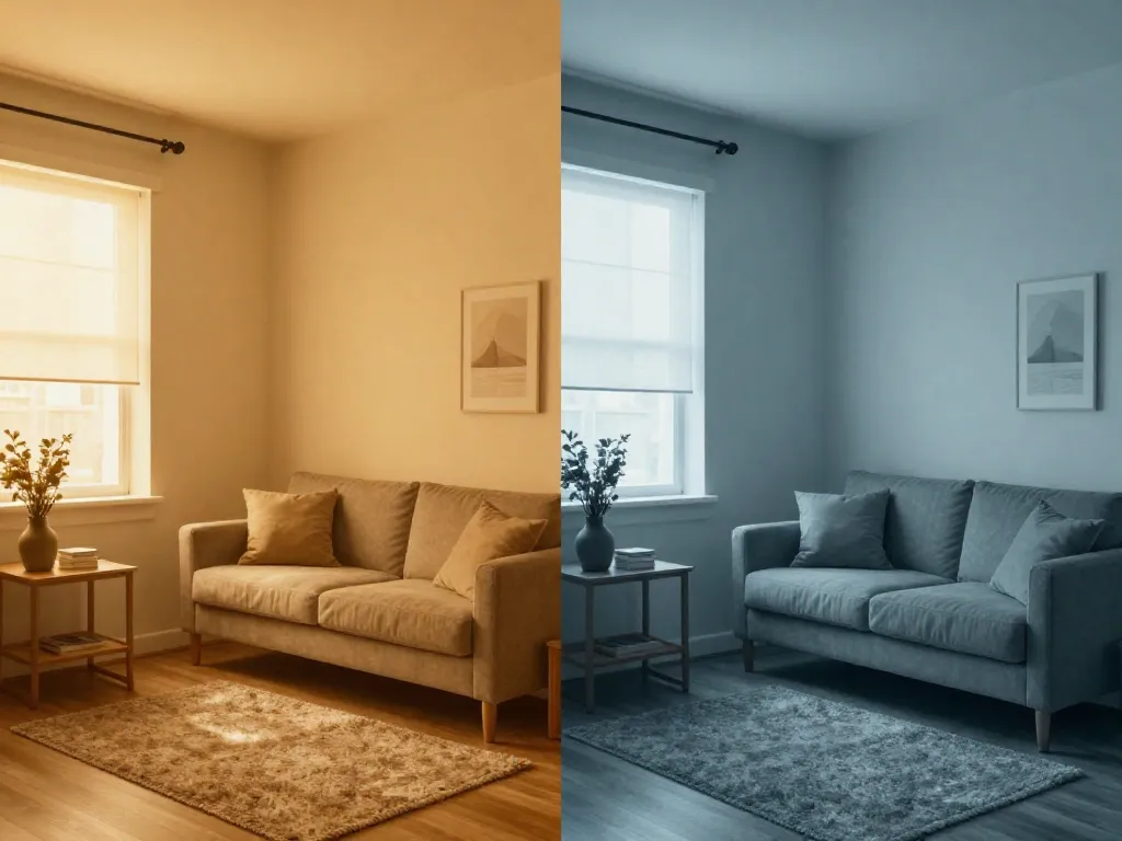 Optez pour des ampoules chaudes (2700-3000K). Évitez le blanc froid (4000K+) qui amplifie la teinte bleuâtre naturelle. Diversifiez les sources : une lampe à poser, un lampadaire d'ambiance, des appliques—jamais un seul plafonnier qui créerait une ambiance "bloc opératoire".