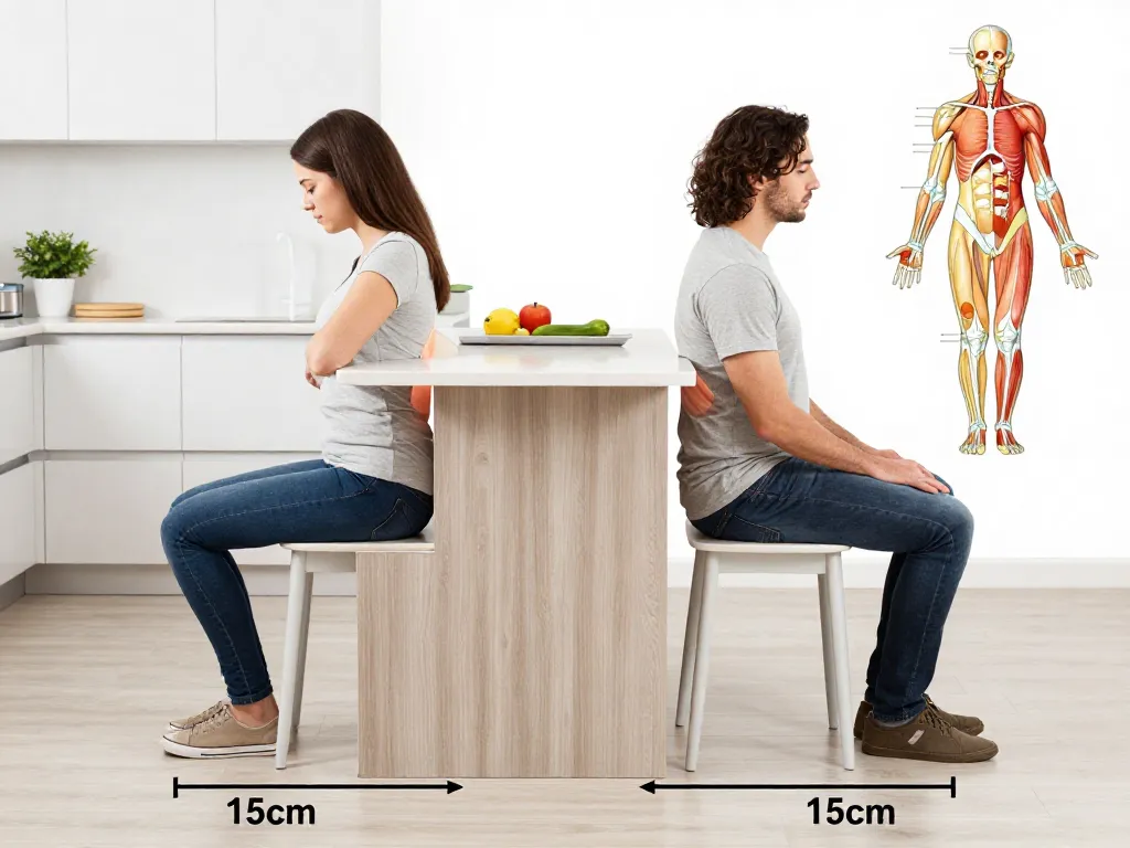 Pour garantir une posture ergonomique et une bonne circulation sanguine, vous devez respecter un intervalle de 25 à 30 cm entre le dessus de l'assise du tabouret et le dessous du plateau. C'est la règle d'or des agenceurs professionnels.