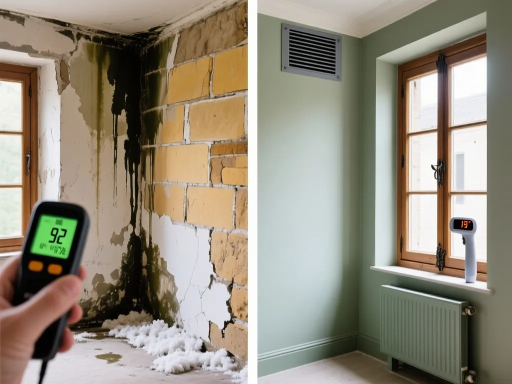 Un psychromètre et un hygromètre à insertion sont vos meilleurs alliés. Ils mesurent l'humidité surfacique et profonde. Seuil d'alerte : au-delà de 85 % d'humidité relative, un traitement par injection de résine hydrophobe ou une barrière capillaire est incontournable.