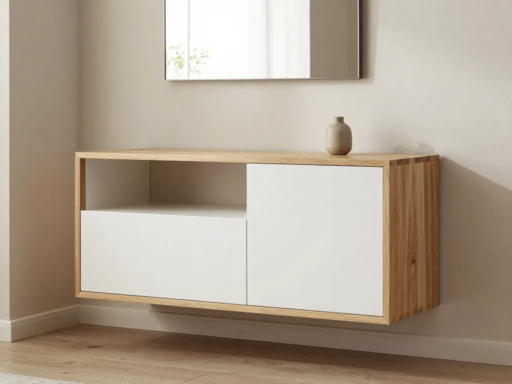- Couloir < 100 cm : Misez sur l'aménagement mural avec des meubles de moins de 20 cm de profondeur.