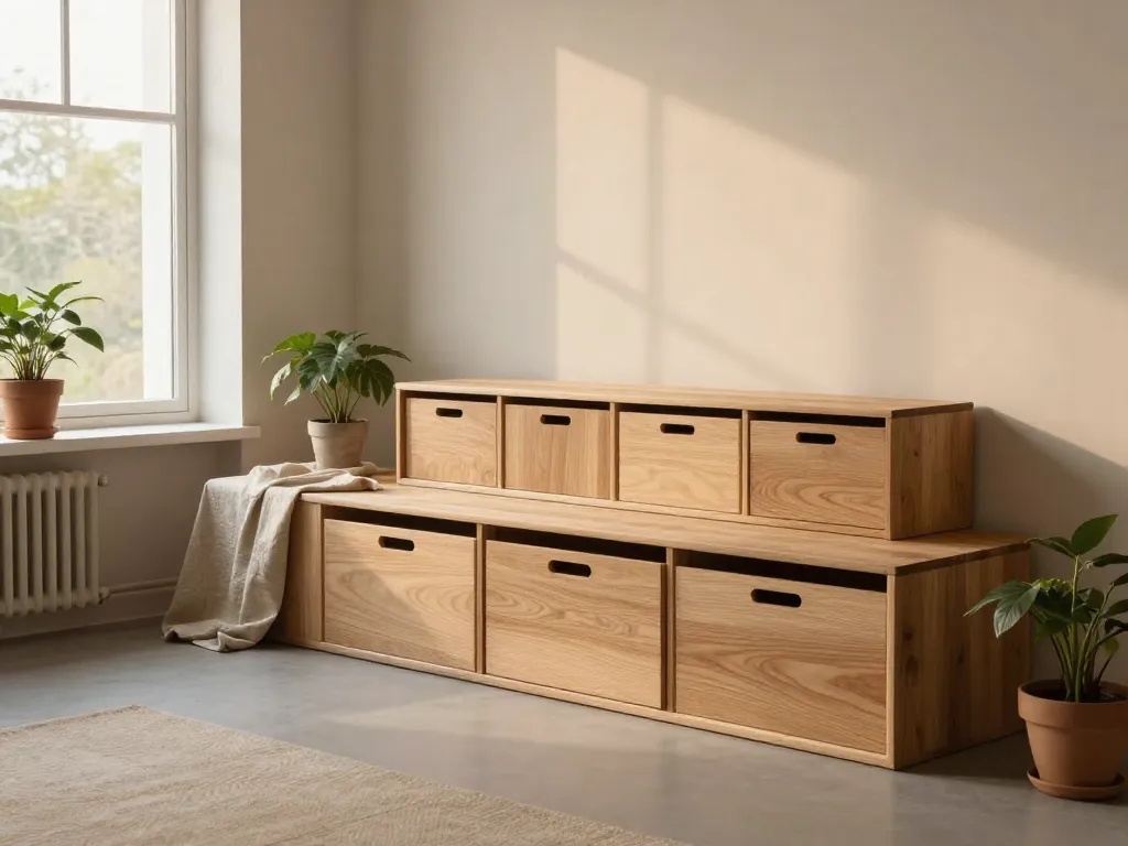 Misez sur la verticalité avec des étagères toute hauteur et privilégiez les meubles multifonctions (canapé-coffre, bureau mural rabattable). Les portes coulissantes et les rideaux acoustiques pour dissimuler le rangement gagnent également en popularité.
