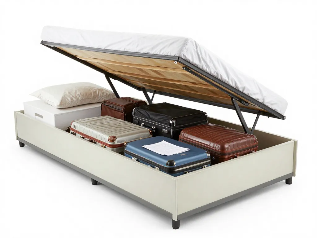 Le Lit Coffre est votre allié majeur. Le sommier se soulève pour dévoiler un espace de stockage généreux : valises, couettes saisonnières, anciens cours. C'est du rangement "gratuit" qui ne pèse rien visuellement.