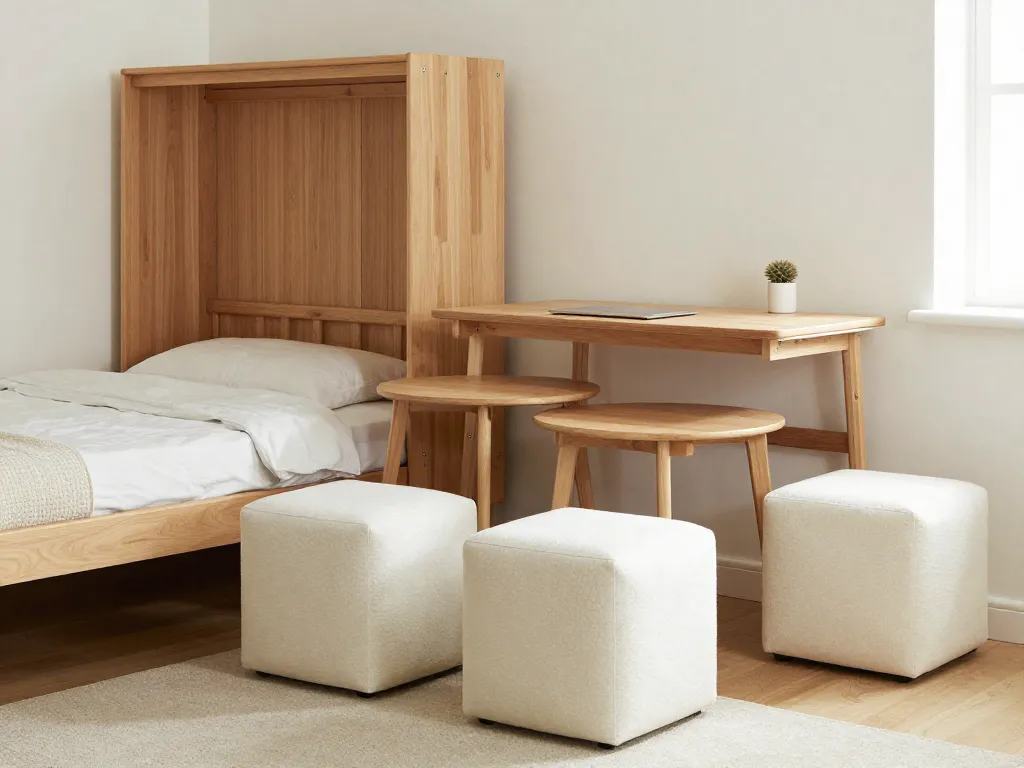 Lit-coffre ou lit escamotable Récupérez 3 à 4 m² de stockage supplémentaire sans sacrifier la surface de vie. Parfait pour les petits appartements où chaque centimètre compte.