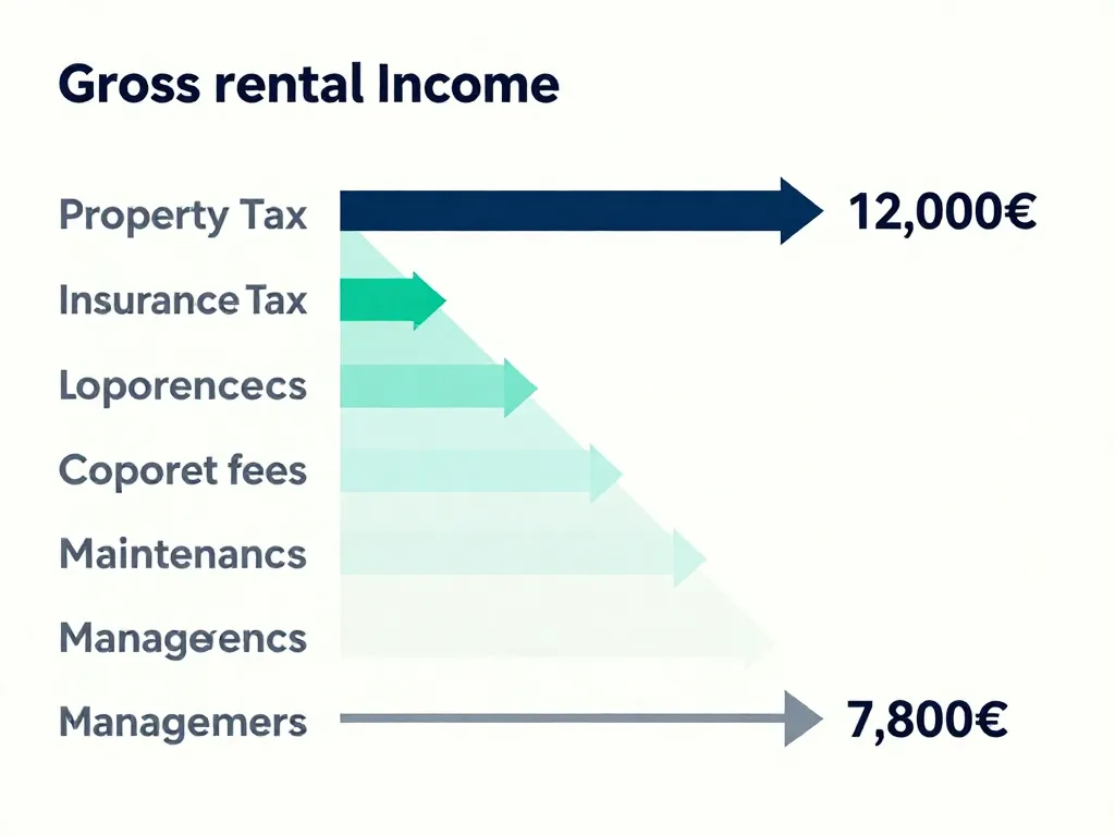 Rendement Net de Frais Il soustrait les charges directes : taxe foncière, assurances, charges de copropriété, frais de gestion locative. Le chiffre commence déjà à baisser sensiblement.