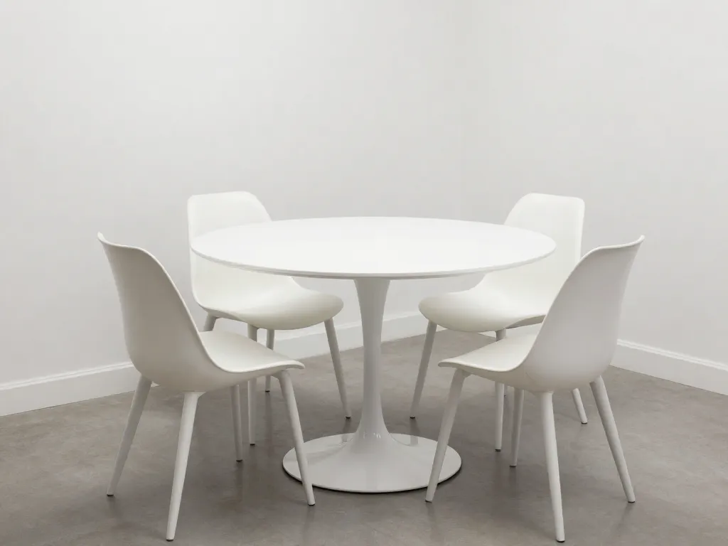 Si vous disposez d'un coin repas carré, privilégiez la table ronde. Contrairement aux tables à quatre pieds, le piétement central élimine la gêne pour les jambes et permet de resserrer les chaises lorsqu'elles ne servent pas. Optiquement, l'absence d'angles agrandit la pièce.