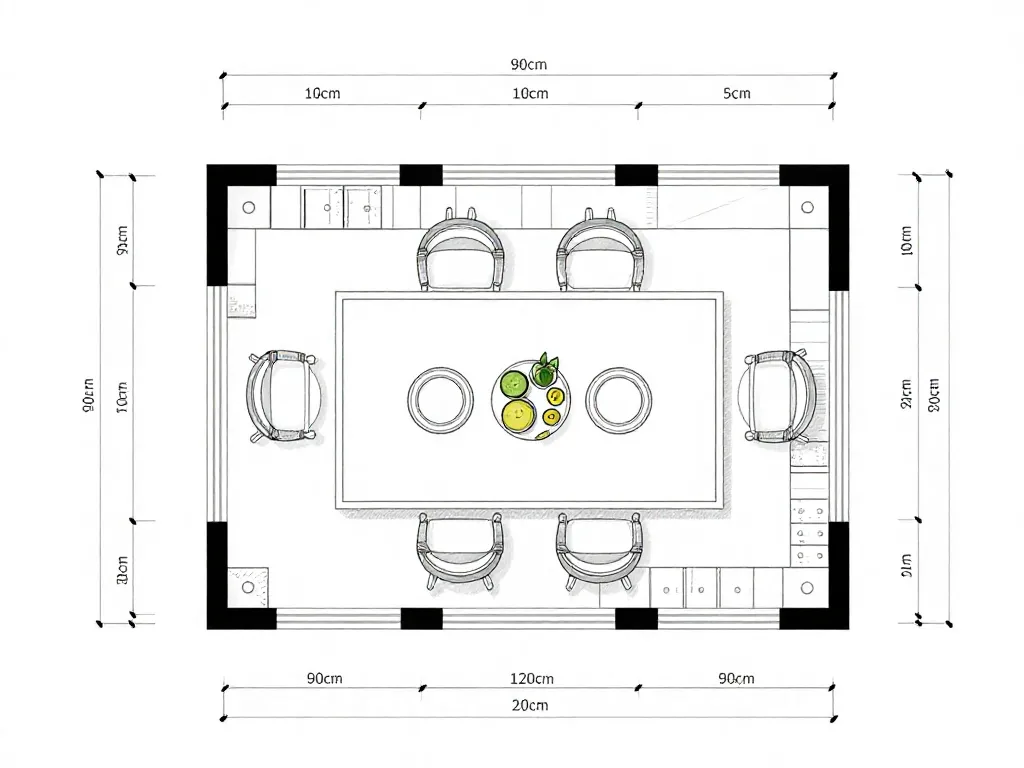 Qu'elle soit ronde ou rectangulaire, une règle ergonomique prévaut : conservez un passage minimum de 90 cm autour de la table. Cela monte à 120 cm si quelqu'un doit circuler derrière une chaise occupée.